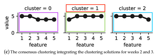 The goal of this step is to make use of the behavioural models built in the previous step to monitor the phenomenon behaviour. As mentioned above, each time interval is represented by a behavioural model. These models together can be used for monitoring purposes. Considering the fact that most real-world datasets contain unlabelled data, the similarity between the detected behaviours can be analysed and assessed with the neighbouring time intervals; i.e., every two consecutive intervals. This is done through the pairwise comparison of the exemplars of the clustering solutions using Equation (2). The assessed similarities can be used for measuring, e.g., a discrepancy between observed performances in the two intervals. When the discrepancy is significant (above a domain specific threshold), further analysis (see Section 4.3) is performed by integrating the produced clusters into a consensus clustering solution; i.e., AP is applied only on the exemplars of the two clustering solutions. In addition, it is important to mention that a significant discrepancy can be interpreted as deviating behaviour; e.g., newly observed patterns in the time interval are absolutely different from the ones in the time interval t.