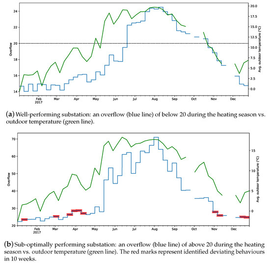 The substation efficiency, , can be used as an indicator to assess a substation’s operational behaviour throughout the entire year. Figure 5 depicts the detected deviations for two substations belonging to the residential category, using their average efficiency and overflow for year 2017. Figure 5a, represents a well-performing substation. Notice that the substation’s efficiency on average is around 98%. In addition, the weekly substation’s overflows for the whole heating season (January–May and November–December) are below 20. Figure 5b, on the other hand, shows a substation with sub-optimal performance during 2017. As one can see, the substation’s efficiency on average is around 80% during the heating season. Moreover, the weekly overflows for the whole year are above 20. In addition, the proposed approach identified deviating behaviours in 10 weeks, which are marked with red.