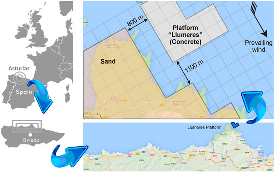 Figure 1 shows the location map and simulated geometry for the first possible location, named the Cape Busto platform, while Figure 2 shows the situation map and simulated geometry for the second location, named the Llumeres platform. In these figures, all distances are expressed in meters. The Cape Busto platform is a rectangular area, located at a minimum distance of 1375 from the coast, while the Llumeres platform is an L-shaped area, located at a minimum distance of only 800 m from the coast. Both platforms are located within shallow water (30–50 m) where the seabed and floating devices will be tested. The nominal characteristics of the platforms can be summarized according to the following data: a total area of 3.5 km2 (1 nautical mile × 1 nautical mile) at approximately 2 km from the coast and with a maximum water depth of 50 m.