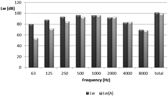 To implement these G90 wind turbines in the software for noise propagation, their total and A-weighted sound power levels were calculated from the data supplied by the manufacturer. These levels are shown in Figure 3 for a typical rotation speed of 15.3 of the wind turbines (corresponding to an 8 m·s−1 wind velocity 10 m from the ground). These noise emissions were certified using IEC 61400-1 and are based on a normalization procedure of the amplitudes in order to compare the frequency distribution of wind turbines with different total sound pressure levels (SPLs) [17]. Notice that the levels of sound power levels for these wind turbines can be found in the frequency range between 500 and 1000 Hz. The total sound power reaches up to 100 dBA.