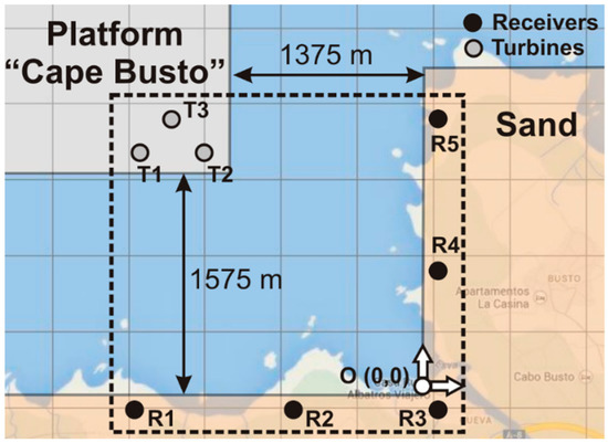 Figure 4 and Figure 5 show in detail the arrangement of the sources (wind turbines) and the considered receivers (five in total) in the two offshore platforms. Corresponding coordinates are given in Table 2 and Table 3. The dashed lines enclose the domain considered for simulation. The turbine positions were established depending on the available geometry in the corresponding offshore platform. In both locations, Cape Busto and Llumeres, the maximum number of allowed wind turbines running simultaneously was considered in order to study the worst case from a noise emission point of view. For the G90 wind turbine, the minimum distance between turbines is 450 m (5 times the rotor diameter) in the prevailing wind direction and 270 m in the direction perpendicular to the dominant wind (3 times the rotor diameter). The wind turbines were placed staggered in order to consider the frequent changes of direction with respect to the prevailing wind. In addition to the individual receivers on the coast, a calculation mesh was considered in order to trace acoustic propagation maps.