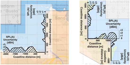Estimated uncertainties for the sound pressure levels (SPL)(A) along the at Cape Busto (left) and Llumeres (right) due to the geometrical simplification of the model.