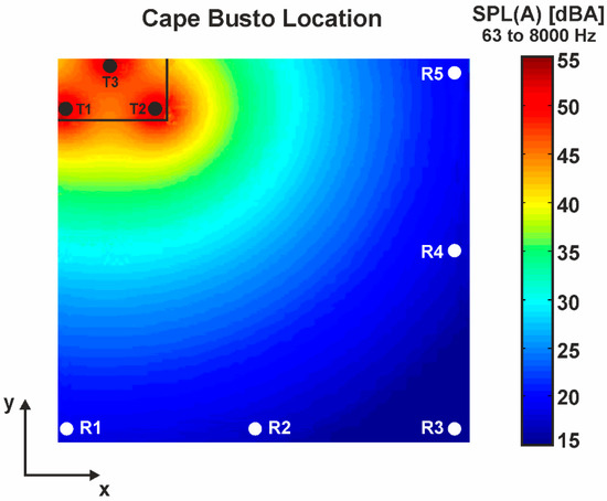 Figure 7 shows the noise map of the A-weighted sound pressure level for the Cape Busto offshore platform. There are no obstacles in the area close to the turbines, so the typical pattern of sound propagation in the free field is recovered in the figure. The maximum noise levels (51.9 dBA) are obtained in the vicinity of the turbines, whereas, after the coastline, these levels are reduced to a value of 18.3 dBA (the color scale was fixed to 15–55 dBA for a direct comparison with the results of the Llumeres platform).