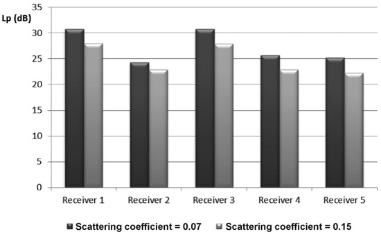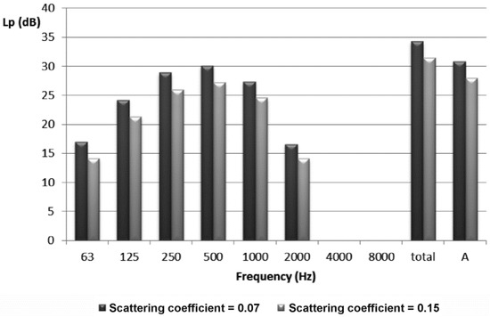 Finally, Figure 10 shows the effect of the scattering coefficient increasing on the octave-band sound pressure levels in Receiver 1. Notice that the reduction of sound pressure levels, which involves the increase in the scattering coefficient, is found to be independent of the frequency, obtaining in this case a total decrease of about 3 dBA. Therefore, an increment of the scattering coefficient involves a reduction in the sound pressure level estimated by the simulation, but without a significant change with respect to the case of 0.07 scattering coefficient.