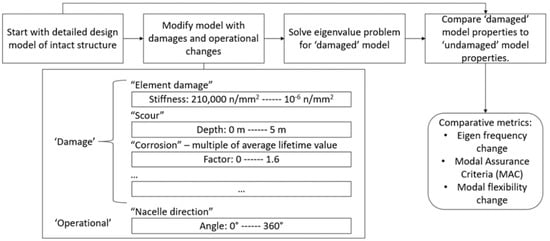 The approach followed in this paper is presented diagrammatically in Figure 1. The process followed is to alter a detailed design model with simulated damages, solve the eigenvalue problem for that model and compare the modal properties to the unaltered model. ‘Damages’ include element damage, global scour and corrosion. The operational condition altered is the nacelle direction.