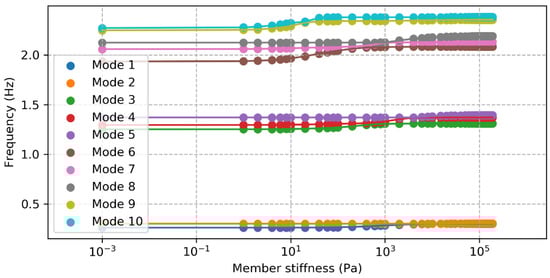 Only the first five mode shapes and corresponding eigenfrequencies are investigated in this paper and the reasons for this come from the rationalization that the aim is to reflect practical measurement of operational global dynamics. While a coupled dynamics analysis will result in modes from sources such as the blades [41], this eigen analysis only gives structural modes, and so, the first five modes are major structural modes. The reason for not using higher modes is that in practice, in an OMA situation for offshore wind structures, lower modes can more reliably be detected and the most significant are first and second order fore-aft and side-side modes [16]. In this structure, the frequency of the sixth mode is much higher than the fifth, and so even with significant damage the frequencies do not change enough for a mode 6 or higher to be mistaken for mode 5 or lower. An example demonstrating the difference in eigenfrequencies can be seen in Figure 2, which shows the eigenfrequencies of the first 10 modes as a leg element is damaged. This demonstration shows that even after a large change in the structure, the sixth eigenfrequency is still much higher than the fifth.
