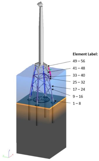 The structure being evaluated is a four-legged jacket structure from the Wikinger wind farm, which is owned by Iberdrola. These jackets are situated in the Baltic Sea with a 39–42 m water depth. Their footprint is 23 m by 23 m, and the jacket is 62 m tall. The turbine is a 5 MW, Adwen AD 5–135 turbines [36]. The structure is fixed to the seabed using 40 m long pile foundations at each leg [37]. The 67 m long blades are not modelled; however, the structure is modelled with the moment of inertia and mass to represent the blades and nacelle.