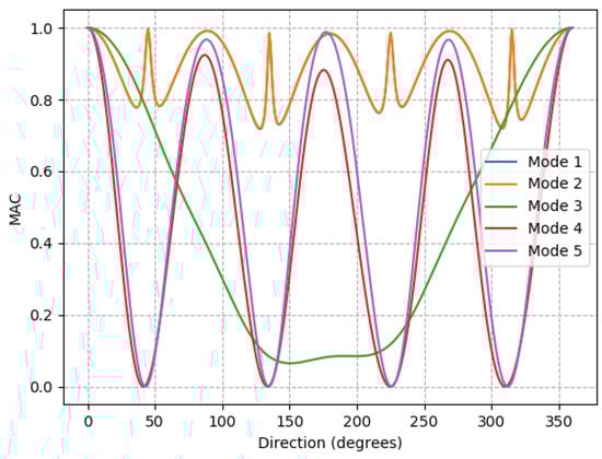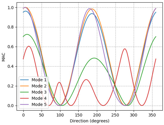 It can be observed from the previous section that, for a given nacelle yaw angle, the impact of loss from a given joint is not the same as a joint on the other side of the structure at otherwise the same location. Due to the mass and momentum of the nacelle and blades, the structure is not rotationally symmetric and so joint losses on different sides have different impacts. This lack of rotational symmetry can be best demonstrated by looking at the effect of damage to a leg element. Figure 11 shows the MAC for the case where a joint halfway up the leg is damaged; the nacelle and blade point-masses are turned a full rotation with their mode shapes transformed back to the original reference. The undamaged plot which this can best be compared to is Figure 5 which is the undamaged case with transformation. The key point from this figure is that the MAC values now exhibit a sinusoidal behavior. If only the first and second modes are detected, then there are directions where the damage is not detectible by MAC, as it is above the threshold, but also nacelle directions where it is much easier to detect the damage as the MAC reaches 0. Additionally, to identify which damage has occurred then the MAC value should also be assessed knowing what direction the nacelle was pointing when the mode shapes were recorded. If a leg next to this leg, at 90 degrees, is damaged at the same height, then the plot of the MAC value for different directions looks the same except that the phase is shifted by 90 degrees.