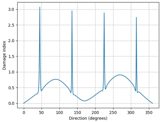 The ‘damage index’ value calculated using modal flexibility varies less with direction, except for the four peaks. This damage index is not quantifying a damage in this case, there is no damage, it is showing the effect on this metric of an operational behavior-it is a difference in the flexibility of the structure, due to this operational behavior. Besides the peaks, the values are all under 0.9, which, by itself, does not mean much but can be used as a reference when quantifying damage cases. The seemingly anomalous results in this plot are the peaks at 45 degrees, 135 degrees, 225 degrees and 315 degrees. The modal flexibility, and hence damage index seen in Figure 7 is more affected by lower modes and these peaks correspond with the rapid change in MAC seen in Figure 5, which are changes in mode shape between the first and second modes. It is possible that these four peaks are an artefact of the numerical solution process, and might not be seen in measurements of a real structure, so this aspect should be taken with caution.