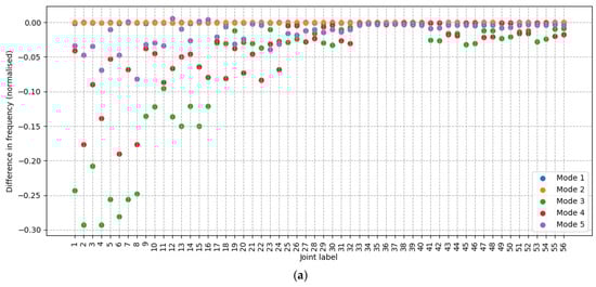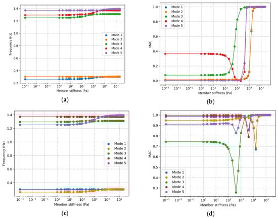 To illustrate the problem, as well as a potential solution to the problem, a leg element is gradually damaged, meaning the stiffness at a joint is gradually reduced. This is also useful from the perspective of damage identification to determine when a damage becomes detectible. In this case, the leg element is halfway up the structure. Figure 8a,c show the mode frequencies as simulated damage is gradually induced. Figure 8a shows comparisons made where the order is based on frequency order, as is the established approach. Choosing the modes to compare based on the order of frequencies is not always the correct approach. Some of the modes have a gradual reduction in frequency, but the reduction stops when it becomes the same as the next mode down, but then the frequency of the next mode down continues the downwards trend–when one frequency passes another, the comparison changes. Figure 8c shows comparisons made where the sum MAC value is maximized using the Hungarian algorithm. With this approach, one frequency can go below the other without the comparison changing. The implication when comparing frequency is that rather than determining the frequency for mode 1 changes by 14% from start to finish, instead mode 2 changes 14% and mode 5 changes 10%.