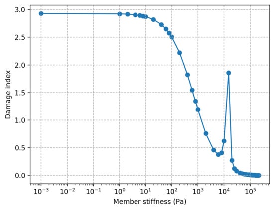 The damage index calculated through the modal flexibility does not have this same question of which modes to compare as all modes are combined before damaged and intact are compared. The damage index calculated for this gradual implementation of damage is shown in Figure 9. This figure shows a peak at the same time modes 1 and 2 have a sharp reduction at 2 × 104, but not any of the other similar sharp reductions. While the MAC returned to a relatively high value, the damage index continued to increase as more damage was implemented, therefore, the damage index is a better choice for quantifying the level of damage.