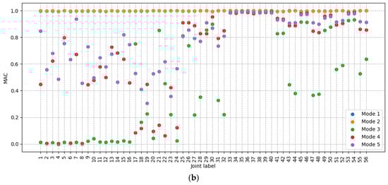 MAC is commonly used to compare mode shapes, not only in numerical modelling, but also in OMA. The equation for calculating the MAC, for two vectors and , is given in Equation (1) [34]. This gives a value ranging from 1 to 0, where a value of 1 indicates that the mode shapes are fully consistent, while a value of zero indicates that they are totally inconsistent.