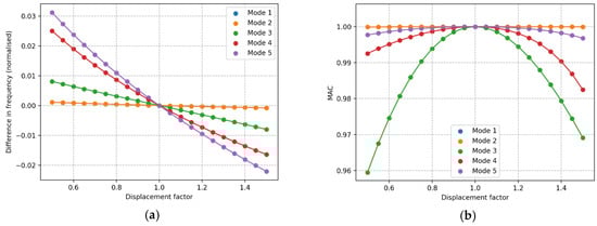 Effect of displacement factor compared to a factor of 1. (a) Difference in frequency, (b) MAC value.