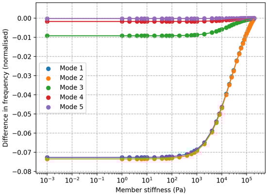 The bolts are not specifically modelled, so instead, the stiffness of the node at the location of the bolted joint is reduced. In this model, stiffness is reduced from its original value down to nearly 0, though this range is just for the sake of exploration and not necessarily realistic, as described in Section 4.4. The change in frequency for the modes is shown in Figure 15. The largest change is in the frequencies for modes 1 and 2—these are both tower modes. This change in stiffness has almost no change on the mode shapes, the MAC values for modes 1 and 2 only reduce to a minimum of 0.999. The damage index is similarly not much changed, only going as high as 0.11 for the minimum stiffness. This is investigated further by taking the lowest stiffness case and applying a change in nacelle direction, as discussed in Section 4.4. The results from changing direction are very much like the undamaged case, except that the first and second mode frequencies are shifted down by the amount shown in Figure 15. As discussed in Section 4.4, the effect of loosened bolts would not be apparent as a gradual change but rather appearing to suddenly change between ‘intact’ and ‘damaged’, depending on the load at the time and if it exceeds the clamping strength.