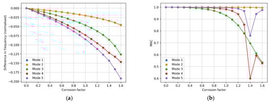 Effect of corrosion relative to the uncorroded structure. (a) Change in frequency, (b) MAC values.