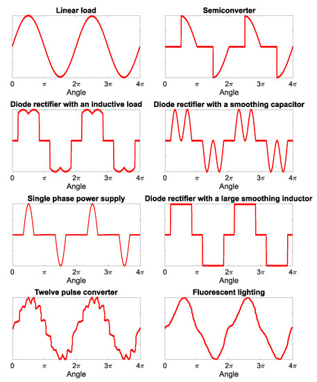 Electrical energy, like any product, has to fulfill quality requirements. Electrical and electronic equipment need a quality electrical supply in order to work properly; this equipment demands sinusoidal voltages and currents without variations in the frequency, the amplitude, or the waveform. These distortions can cause malfunctions, reduce the service life, and decrease performance [4,5,6]. However, it is usually the equipment itself in a facility, such as power electronics devices with non-linear characteristics [4,7], that distorts the electrical supply. Some examples of non-linear loads are rotating machines, computers, lighting, lifts [6], and electrical vehicle chargers [8]. Figure 2 illustrates some current waveforms produced by common non-linear loads [9].