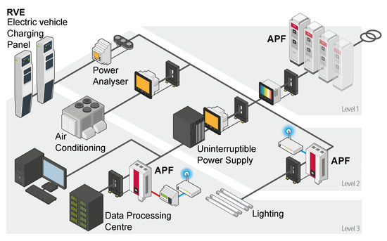 In order to avoid these problems, and to improve grid quality, it is usual to use filters to mitigate distortions propagated through the PCC; active power filters (APFs) are an attractive solution. A parallel (shunt-connected) APF can compensate for current harmonics, reactive power, and unbalanced currents [19,20,21]. Figure 3 shows the connection of APFs at PCCs to improve grid quality [6]. In this figure, we can differentiate three levels. Level 1 is the PCC, where the majority of APFs would be connected, since this is the point with the most distortion. In level 2, the power supply consumption of some loads is monitored and analyzed. Furthermore, voltages and currents are filtered to supply specific loads such as electric vehicle chargers, lighting and, uninterruptible power supplies. Illumination is a primary source of harmonics [17], so the figure depicts an APF compensating the harmonics of these loads. Finally, in level 3, there are the remaining loads connected to the grid. Within this level, there is a data processing center, another significant source of disturbances [17], and an APF is required to compensate its harmonics.