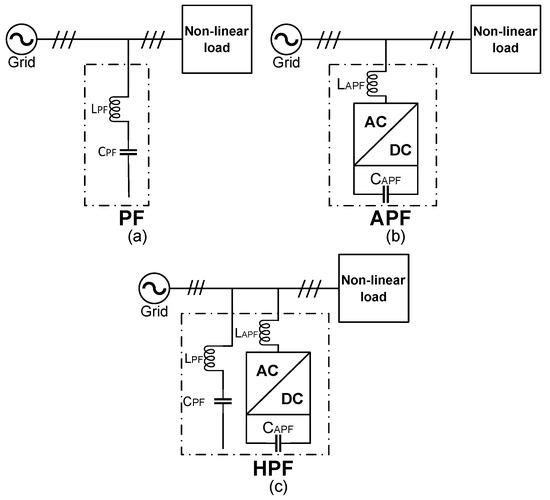 Filter topologies: (a) passive filter (PF); (b) active power filter (APF); (c) hybrid power filter (HPF).
