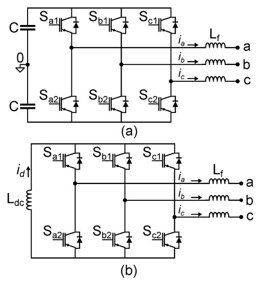 Main topologies of two-level three-wire APFs: (a) voltage source converter (VSC); (b) current source converter (CSC).