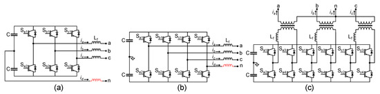 Main topologies of two-level four-wire APFs: (a) three-leg voltage source converter (3L-VSC); (b) four-leg voltage source converter (4L-VSC); (c) six-leg converter (6L). The optional fourth inductance is drawn with dashed red lines.