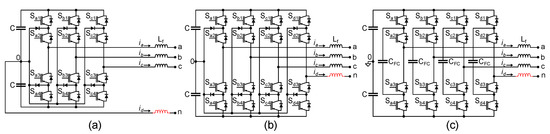 Main topologies of multilevel four-wire APFs: (a) three-leg neutral-point-clamped (3L-NPC); (b) four-leg neutral-point-clamped (4L-NPC); (c) four-leg flying capacitor (4L-FC). The optional fourth inductance is drawn with dashed red lines.