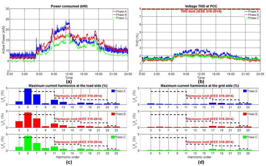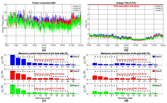 The literature on power quality focuses on different topics. Some authors introduce techniques for improving the power quality of distribution networks, such as using static compensators [24], distributed energy storage systems [25], and hybrid power filters for unbalanced low-voltage grids [26]. Others focus on improving power quality in grids containing unbalanced systems. The majority of these articles introduce novel control techniques using series hybrid power filters [27], shunt active filters [28], or unified power quality conditioners [29]. In [30], there is an extensive review of the control algorithms of APFs for different grids, including the unbalanced ones. A significant trend is the detection of distortions; the most important techniques for identifying the harmonics of a distorted signal are analyzed in [31]; in [15], there is a review of existing techniques to automatically identify the most common power quality disturbances, such as voltage sags, harmonics, and frequency deviations. Moreover, a novel method for harmonic extraction in unbalanced grids is presented in [32]. Because artificial intelligence is an important trend, implementing neural networks to classify grid disturbances was proposed in [33,34]. Power quality is also critical in microgrids, and some works have addressed this issue. A centralized control algorithm for selective harmonic compensation, which takes advantage of the use of distributed electronic converters, is proposed in [35]. In [36], the management of the microgrid-APF resources is optimized from an economic point of view. Some papers compare the standards for grid quality or efficiency in, for example, DC grids [37] or the European Union [38]. However, few papers show the effect of proposed strategies in real grids. In [39], the authors proposed an open unified power quality conditioner and installed it in an actual low voltage grid in Italy. Another work studied different topologies of passive filters and simulated their impact using real data from an industrial plant [40]. In [41], the authors propose a new passive filter design method. The work uses data from a petrochemical factory located in Egypt to assess the effectiveness of the proposed method. Another work uses data from a microgrid located in Canada to analyze if an APF can improve its power quality [42]. Finally, in [12], the authors used data collected from two different industrial environments to simulate the effect of passive and active filters on the grid quality.