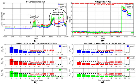 One of the most important contributors to bad power quality is the presence of harmonics on the electrical grid. The connection of non-linear loads causes harmonic currents to flow in the power system [10,11,12], which can distort the supply voltage waveform at the point of common coupling (PCC) because of the source impedance [13]. An important consequence of harmonics is that they can cause damage to loads connected to the PCC in different ways. In conductors, current harmonics increase the Joule effect losses [13]. Harmonics also increase the losses in the copper windings and core of a transformer, causing a temperature increase and reducing the unit’s lifespan. In electrical motors, harmonics can reduce the useful torque and decrease performance. Harmonics can cause unexpected activation of protective devices such as circuit breakers [6,13]. The presence of harmonics is also undesirable for communication systems. Depending on the frequency, the degree of coupling, and the equipment sensitivity, certain harmonics can introduce noise or interference into communications circuits [14]. Even more critical effects can occur; harmonics can propagate through connected electrical subgrids, create a failure through interdependencies, and result in blackouts [15].