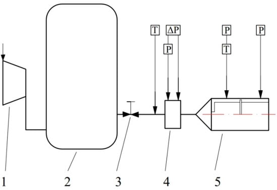 Diagram of the test stand for labyrinth seals, 1—compressor, 2—main tank, 3—regulator valve, 4—orifice flow meter, 5—body with the geometry under consideration.