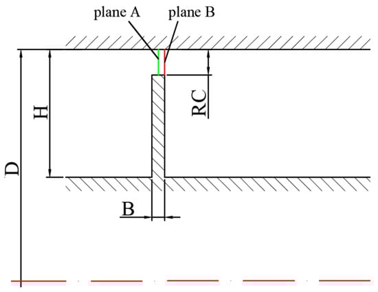 The results from the course of streamlines (Figure 9a) show that the smallest clearance, on the tooth top, forms a vortex, which restricts the flow in such a way that the flow takes the shape of an asymmetric convergent–divergent nozzle (asymmetric since in the upper part of the clearance, the flow is limited by flat body wall). It is worth noting that the flow area over the front and back (plane B) tooth edge is very nearly equal to the geometric area. For the clearance, RC = 0.542 mm; when compared with RC = 0.362 mm, the flow area decreases over the back edge of the tooth (plane B), where the reverse flow appears. From the clearance RC = 0.752 mm, the “jet” has a significantly different shape when compared with RC = 0.542, which does not resemble the convergent–divergent duct. The flow area along the clearance length decreases steadily. In the end part of the clearance, the recirculation zone intensifies greatly. Phenomena responsible for the flow contraction intensify for the geometry RC = 1.067 mm (Figure 9d), which can be confirmed by data presented in Figure 4 and Figure 7.