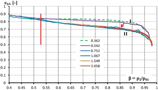 The first trend is characterized by considerably larger values of the coefficient cSV in the whole range of the pressure ratio β being investigated (Figure 3).