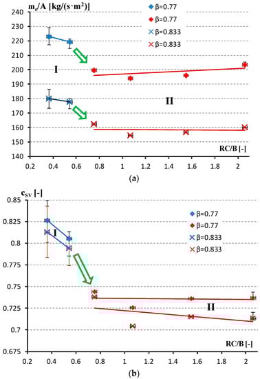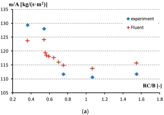 In Figure 4a, we can observe a change of the mass flow to flow area ratio for β from 0.77 to 0.833. However, for the first data group (I) (marked in blue on the graph), when the ratio RC/B increases, the ratio decreases slightly, and for the second data group (II) (marked in red on the graph), the value is almost constant for the range RC/B from 0.752 to 2.058.