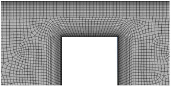 To explain the change of integrity of the examined geometry we simulated the gas flow in the clearance using the Fluent software. The analyzed geometry is the 2D axisymmetric geometry. In the boundary layer, we establish 20 grid cells. To perform detailed analysis of the gas flow in the clearance, we used the k-ω SST turbulence model. We included the condition y+ < 2 in the boundary layer. A sample grid is shown in Figure 5.