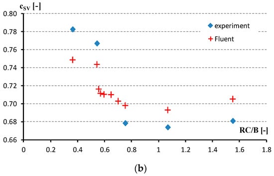 Data in Figure 7, obtained using the Fluent software, show a slight change of and cSV between RC/B = 0.542 and 0.555. For higher values of RC/B, from 0.555 to 0.752, we can observe smooth changes, but at a steep gradient.