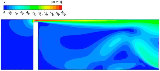 The maximum gas velocity was achieved in the central part of the clearance at approx. 220 m/s (Figure 8). Downstream the clearance, a “jet” is created. Due to the gas vortex behind the back wall of the tooth and the presence of the body wall above the clearance, the gas velocity in the “jet” is reduced sharply.