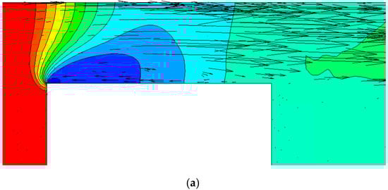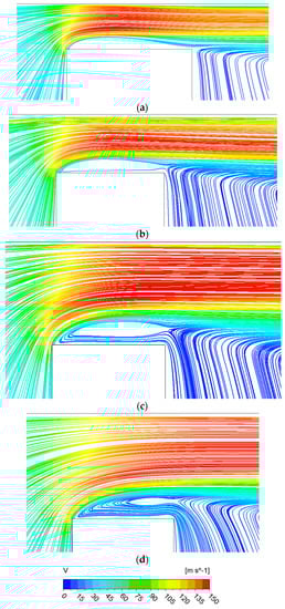 A steep increase of the low-pressure area intensifies the strong recirculation zone over the tooth edge (Figure 10a). As a result, the reverse flow increases, which in turn causes the growth of the flow contraction phenomenon, which can be observed in Figure 9c,d.