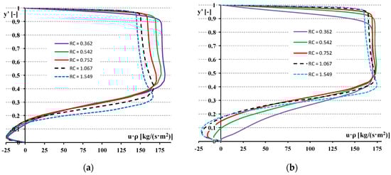 The distribution in the bottom part of the clearance below y’ = 0.2 indicates that there is reverse flow of the velocity, achieving 25 kg/(s·m2), which is similar for the clearance heights being analyzed.