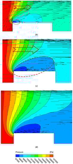 Distribution of the static pressure with the velocity vector in clearances (a) 0.362, (b) 0.542, (c) 0.752, (d) 1.067 mm high.