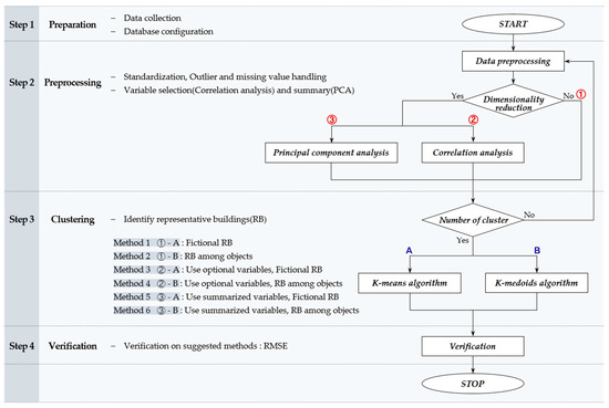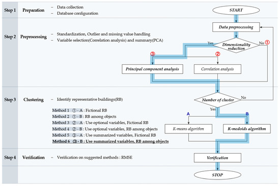 Therefore, method 6 applying principal component analysis and K-medoids algorithm is proposed as a methodology for defining representative buildings in existing residential buildings as shown in Figure 7.