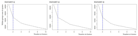 The analysis results showed a rapid decrease in SSE until all three data sets had two clusters, followed by a trend of gradual decline (Elbow point = 2).