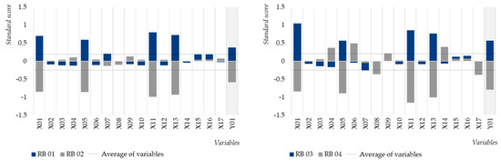 Figure 3 shows the variables of representative buildings derived by Methods 1 and 2. RB 01, 02 and RB 03, 04 have similar values for each variable, but are located in opposite directions, indicating opposite patterns.
