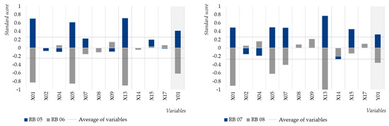 In the case of K-means in method 3, an algorithm to generate the center coordinates was applied, so values were omitted for some variables. Figure 4 shows the variables of representative buildings derived by methods 3 and 4. RB 05, 06 and RB 07, 08 have similar values for each variable, but they are located in opposite directions, indicating opposite patterns. In addition, the patterns of RB 05 and RB 07, RB 06 and RB 08 showed similar patterns. RB 05 and RB 07 showed an average difference of 7.05%p, and RB 06 and RB 08 showed an average difference of 8.08%p.