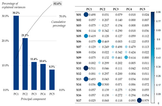 Methods 5 and 6 performed clustering by constructing a dataset (③) from which variables were extracted by principal component analysis in the dimensionality reduction process after data preprocessing. As a result of performing principal component analysis, it appeared as shown in Figure 5. The first main component (PC1) explains the existing variable by 30.2% and PC2 by 21.1%, and up to PC5, 81.63% of the existing variable can be explained and summarized into five independent variables.