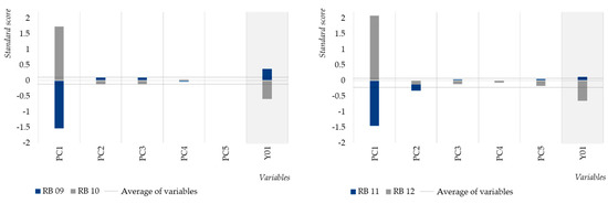 In the case of Method 5, which creates an imaginary center point, values are omitted for the existing variables used for principal component extraction In both methods, the difference is clearly revealed in the variables PC1 and Y01, and representative buildings with particularly opposite values in the building envelope U-value, which is the first main component containing the most information on the existing variables, were derived. Figure 6 shows the parameters of representative buildings derived by methods 5 and 6. RB 09, 10 and RB 11, 12 have similar values for each variable, but they are located in opposite directions, indicating opposite patterns. In addition, the patterns of RB 09 and RB 11, RB 10 and RB 12 have similar patterns. When comparing only the dependent variable, RB 09 and RB 11 show a difference of 5.05%p, and RB 10 and RB 12 show a difference of 22.37%p.