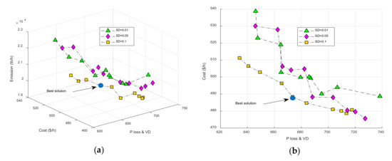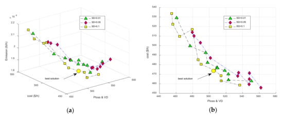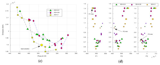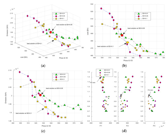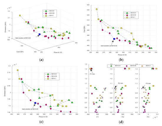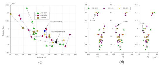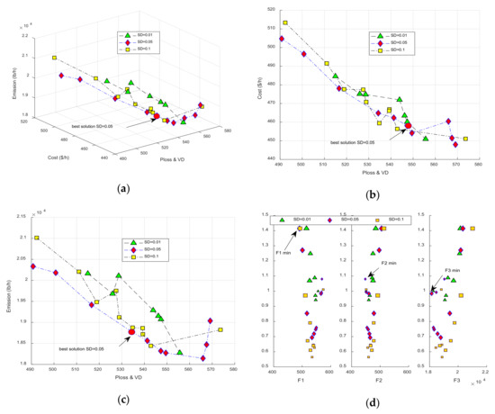Figure 9. The performance of network under commercial load model in the summer season, best solution obtained by SD = 0.1 and SD = 0.05 are depicted in Figure (ac), min value of different objectives is shown in Figure (d).