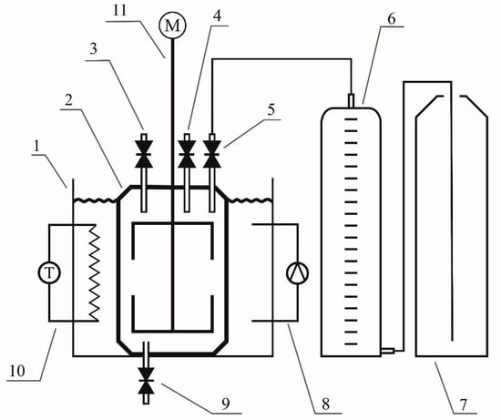 The digester used in the experiment for the production of biogas in the continuous mesophilic anaerobic digestion process; 1—water bath; 2—bioreactor; 3—stub pipe for dosing substrates and process additives; 4—stub pipe for sampling/biogas composition analysis; 5—stub pipe for discharging biogas to eudiometer; 6—eudiometer; 7—collection/expansion vessel; 8—circulation of water in water bath with pump; 9—stub pipe with drain valve for sampling of digested biomass; 10—thermoregulator with electric heater; 11—double anchor agitator with drive and speed regulation.