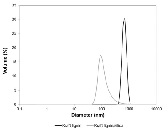 Particle size distributions by volume of kraft lignin and the kraft lignin/silica system.