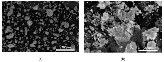 Figure 2 shows the particle size distributions by volume of kraft lignin and the kraft lignin/silica system (1:4 ratio by weight). The narrow band for kraft lignin indicates a small range of particle diameters and the monodisperse nature of the sample—the highest share, i.e., 31.0% was noted for particles with a diameter of 712 nm []. The kraft lignin/silica system was characterised by a wider band, with the highest share (17%) of particles with a diameter of 105.7 nm. As the share of silica in the system with lignin was four times higher, there was an increasing tendency to form particle aggregates. The SEM images (see Figure 3a,b) also showed that the kraft lignin/silica carrier was characterised by greater morphological diversity than kraft lignin on its own, because there were irregularly-shaped and porous microstructures observed in the aggregates of particles in the compound system. Rough, porous surfaces favour the immobilisation of microorganisms and their proliferation [].