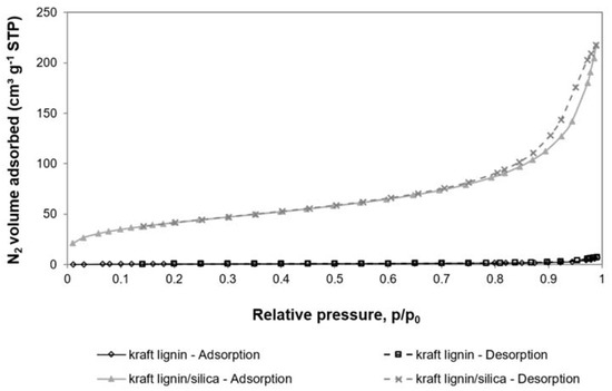 N2 adsorption/desorption isotherms of kraft lignin and the kraft lignin/silica system.