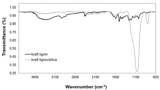 The FTIR spectrum of the kraft lignin/silica system (1:4 ratio by weight) differs significantly from the spectrum of pure lignin due to the dominant content of silica. Like the band of kraft lignin, the band of the kraft lignin/silica system ranges from 3600 to 3200 cm−1 and corresponds to O–H stretching vibrations. On the other hand, the maximum at a wavenumber of approximately 1630 cm−1 is assigned to O–H bending vibrations and corresponds to the presence of water bound physically to the material. The spectrum is dominated by the 1080 cm−1 band, which is assigned to Si–O–Si stretching vibrations, and by the ∼800 cm−1 band (Si–O stretching vibrations). The results of our experiment are consistent with the data published in earlier studies [,].