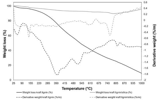 The knowledge of the temperatures of decomposition of microbial carriers is particularly important for biotechnological processes conducted at increased temperature. During anaerobic digestion, the value of this parameter may be significant when the process is carried out under thermophilic conditions (50–60 °C). The thermal stability of kraft lignin and the kraft lignin/silica system (1:4 ratio by weight) was determined by means of thermogravimetric analysis (Figure 7).